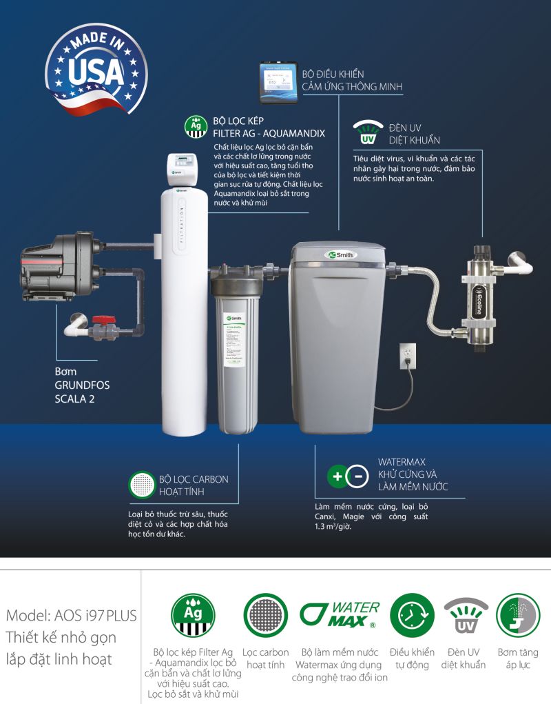 Thấu hiểu điều này, Hệ thống lọc nước đầu nguồn A.O.Smith AOS I97 Plus sẽ giúp bạn giải quyết nhanh chóng các vấn đề trên với việc sử dụng: