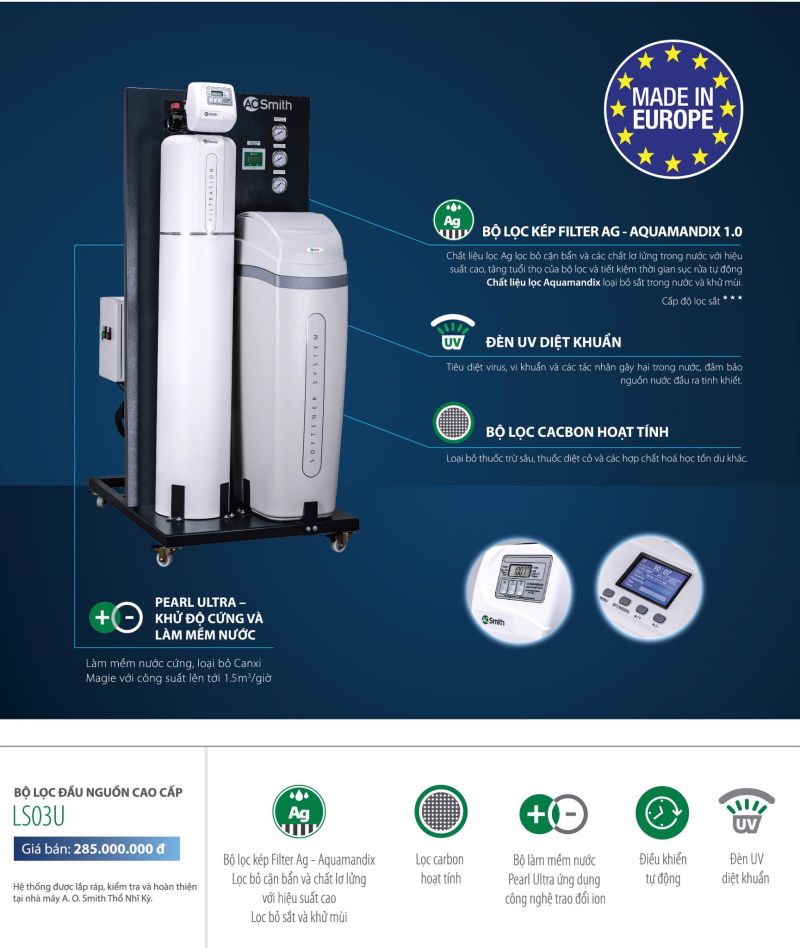 Hệ thống lọc đầu nguồn cao cấp A.O.Smith LS03U được ứng dụng công nghệ tân tiến, sản xuất từ châu Âu, đem lại tiện nghi tối đa cho căn nhà của bạn. Đây là một trong những sản phẩm được người tiêu dùng đánh giá cao hiện nay trên thị trường máy lọc nước Việt Nam. Hãy cùng Vua Lọc Nước tìm hiểu ngay về những ưu điểm nổi bật của hệ thống lọc đầu nguồn cao cấp này nhé!
