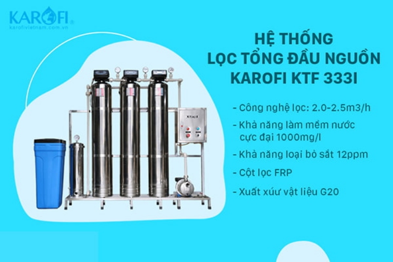 Hệ thống lọc tổng Karofi KTF-333I được thiết kế tinh tế vừa vặn và phù hợp dành cho các hộ gia đình, các cơ sở sản xuất, kinh doanh nhỏ lẻ giúp bạn hoàn toàn yên tâm với khả năng loại bỏ các chất gây hại như: kim loại nặng, hợp chất hữu cơ, sắt, crom, mangan,…hay những chất cực độc như asen.