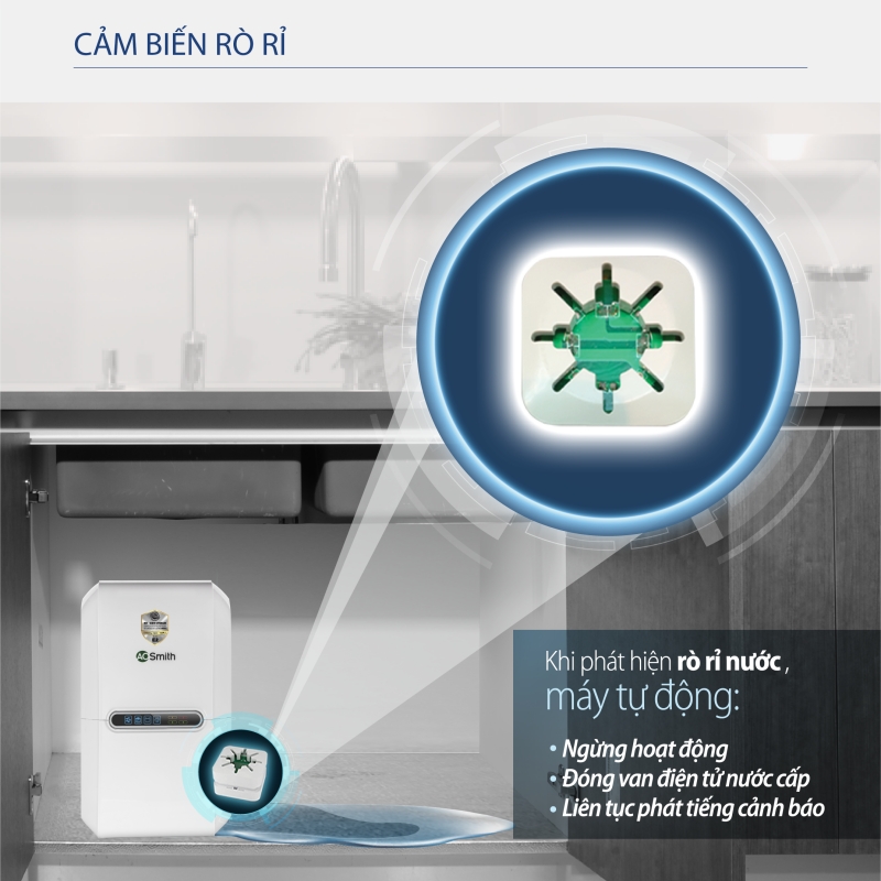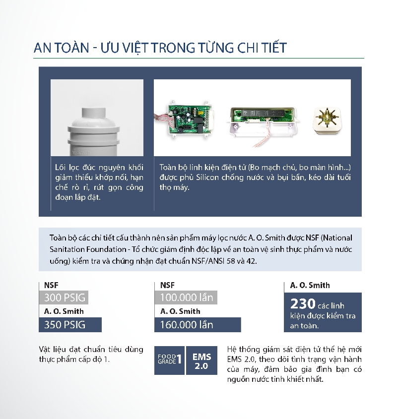 – Hệ thống giám sát điện tử EMS 2.0 của máy lọc nước A.O. Smith E2: Hệ thống thông minh này cho phép phát ra cảnh báo về tình trạng hoạt động của máy cũng như những sự cố có thể xảy đến để người dùng biết và xử lý kịp thời. Các chức năng cảnh báo bao gồm: cảnh báo thay lõi lọc, cảnh báo rò rỉ, sục rửa lõi lọc tự động, van điện từ tích hợp, cảnh báo lỗi vận hành.