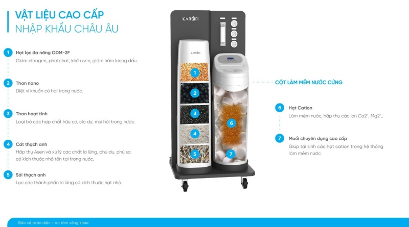 Cùng với đó, cũng giống như những sản phẩm được sản xuất tại Karofi, nguồn nguyên liệu được sử dụng trong hệ thống lọc là nguồn nguyên liệu cao cấp nhập khẩu từ các nước như Mỹ, Hà Lan, Ý,…, quy trình sản xuất khép kín trên dây chuyền công nghệ hiện đại hàng đầu thế giới. Không chỉ vậy, mỗi sản phẩm trước khi đưa ra thị trường đều được kiểm nghiệm nghiêm ngặt đảm bảo các chức năng hoạt động tốt nhất.